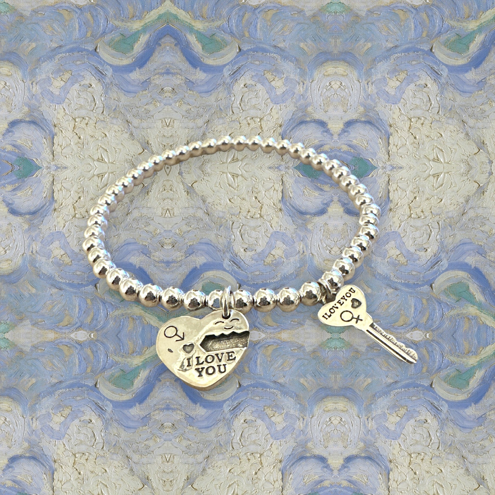 This S925 sterling silver bracelet features a delicate pairing — a heart charm engraved with “I LOVE YOU” and a tiny key that symbolizes trust, intimacy, and love.